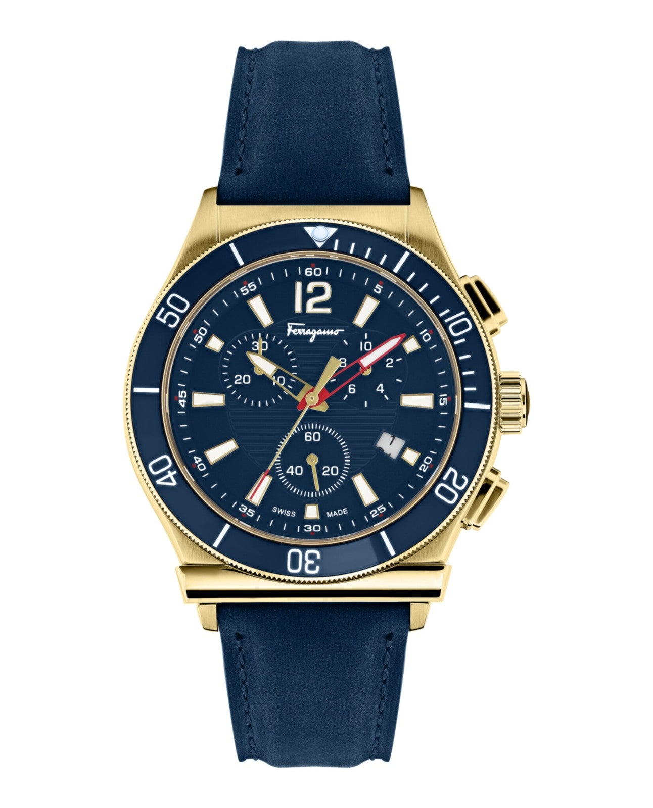 The Salvatore Ferragamo 1898 Sport Chronograph Watch is a bold fusion of Italian luxury and sporty functionality. It reinterprets the brand's elegant 1898 design language with a larger, more robust case, a complex chronograph dial, and vibrant colors, creating a dynamic and sophisticated statement piece. Here's a closer look at its key specifications: