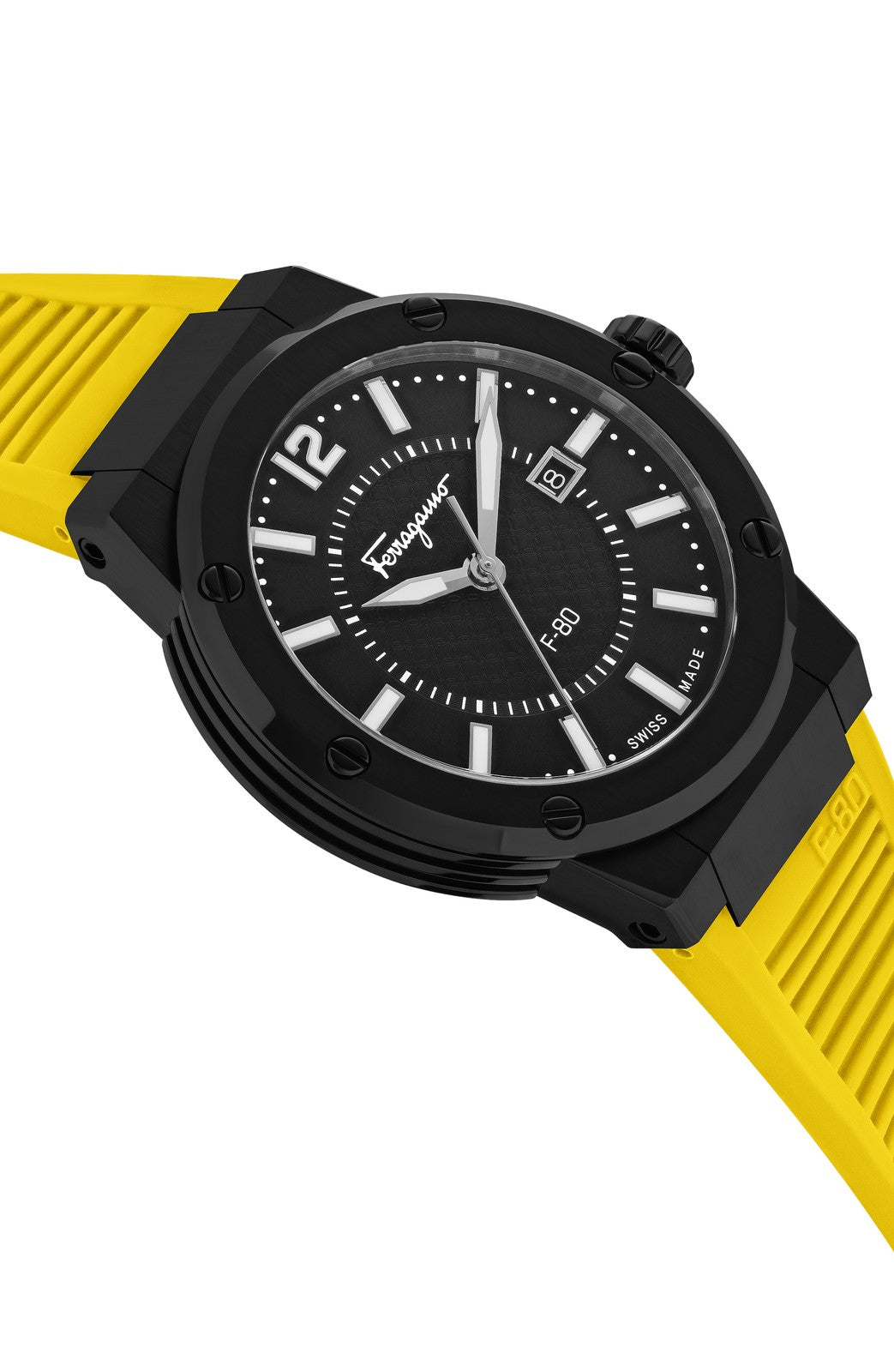 The Salvatore Ferragamo F-80 Quartz Black Dial Men's Watch SFHY01522 is a bold and contemporary luxury timepiece that blends Italian design flair with Swiss precision. Featuring a striking black dial contrasted by a vibrant yellow silicone strap, it makes a confident modern statement while offering sporty durability. Here's a closer look at its key specifications: