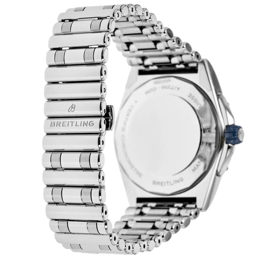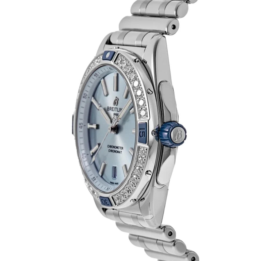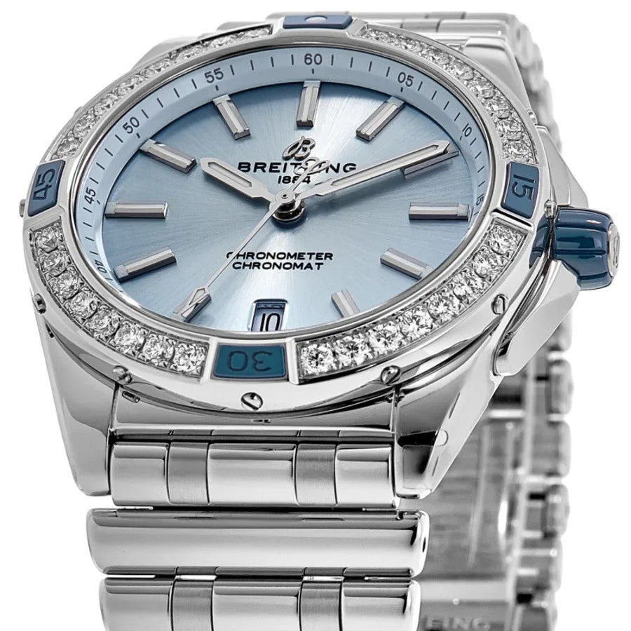 The Breitling Super Chronomat Automatic 38 A17356531C1A1 is a dazzling fusion of luxury jewelry and high-performance Swiss watchmaking. Featuring an exquisite ice blue dial and a diamond-set bezel, it's built for elegance, precision, and a versatile sporty-luxe appeal. Here's a comprehensive look at its key features: